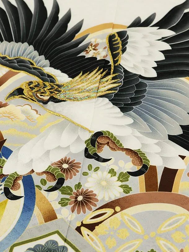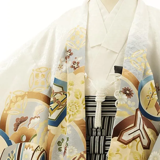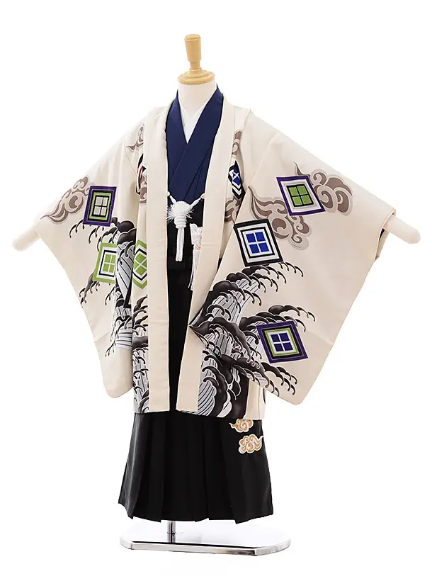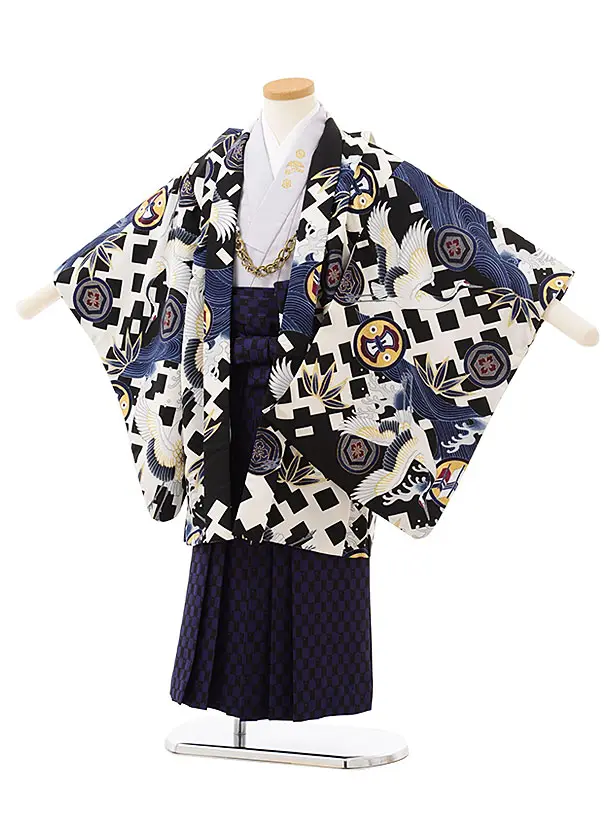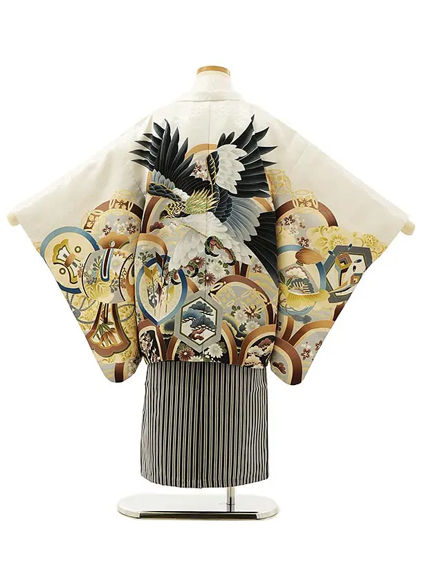 かんたん七五三レンタル(5歳男袴)5989白地吉祥文様鷹×黒白縞袴