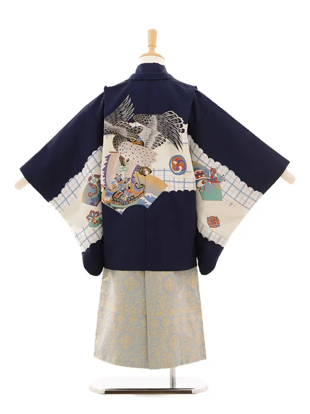 七五三(5歳男袴)D016 紺地鷹に宝舟×グレー地袴