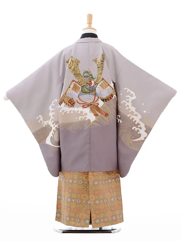 七五三(7歳男袴)G035グレー波にかぶと×金地袴