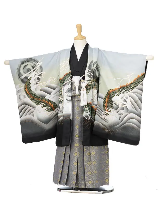 七五三(7歳男袴)G035グレー波にかぶと×金地袴