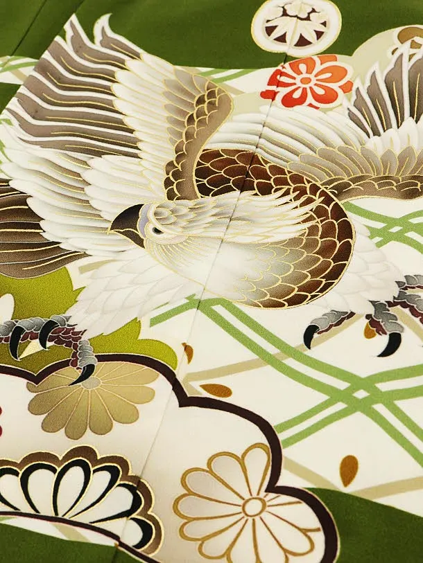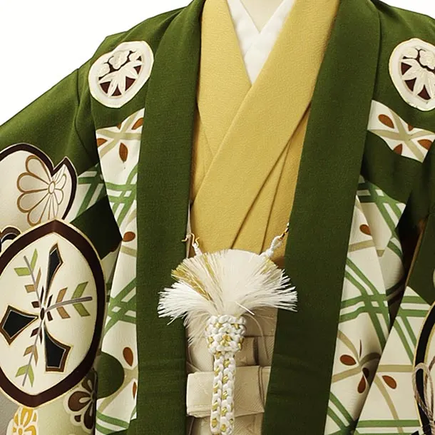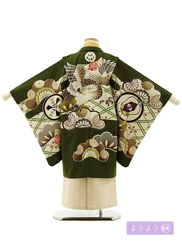 七五三(5歳男袴)O029 【ようよう】 グリーン地に鷹松×ベージュ袴