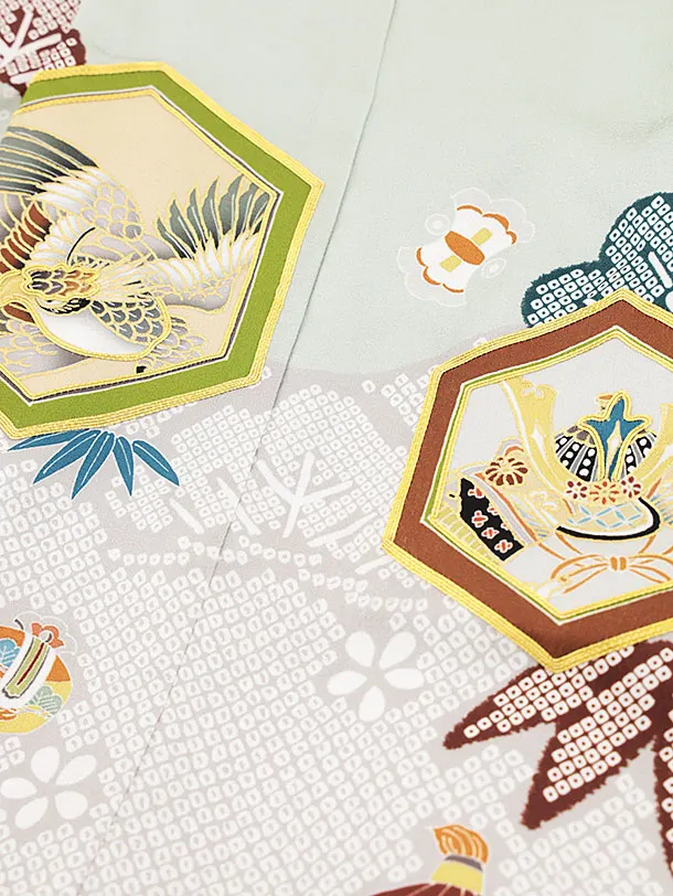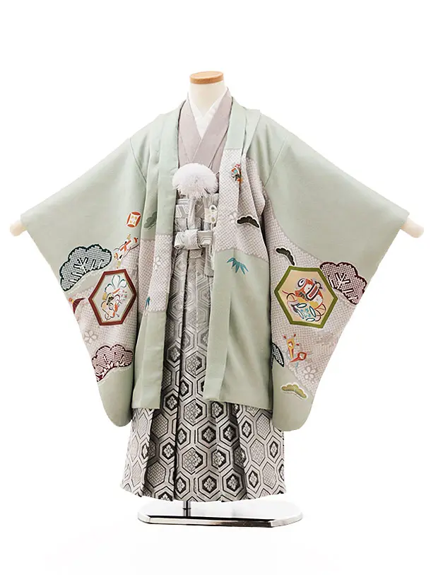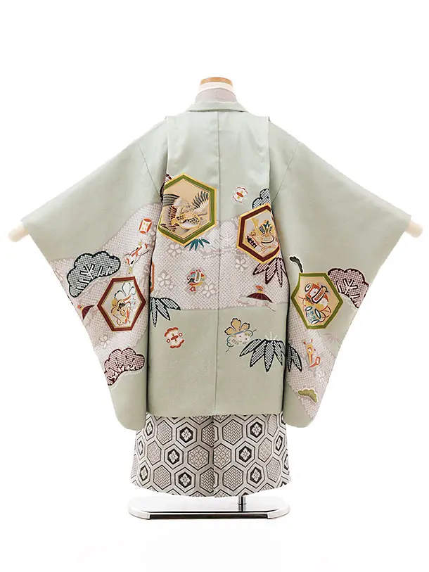 七五三(5歳男袴)O124 (正絹)【ようよう】ヒワ色亀甲吉祥文様×シルバー亀甲