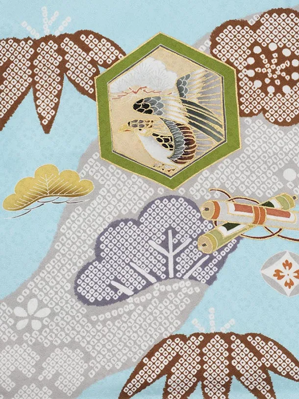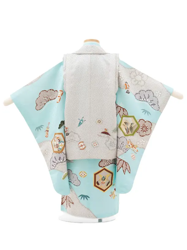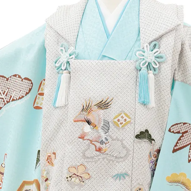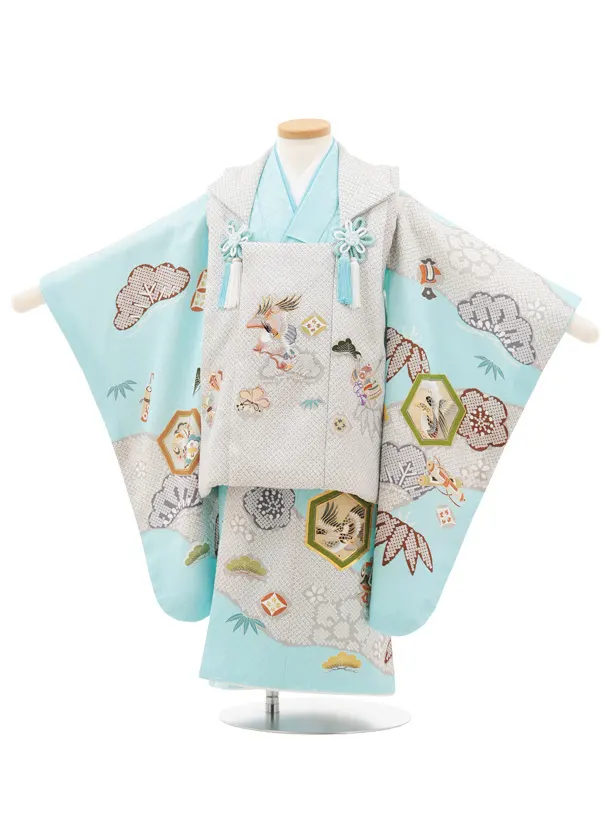 七五三(3歳)O221【正絹】【ようよう】薄グレー疋田柄 刺繍鷹×水色 吉祥文様