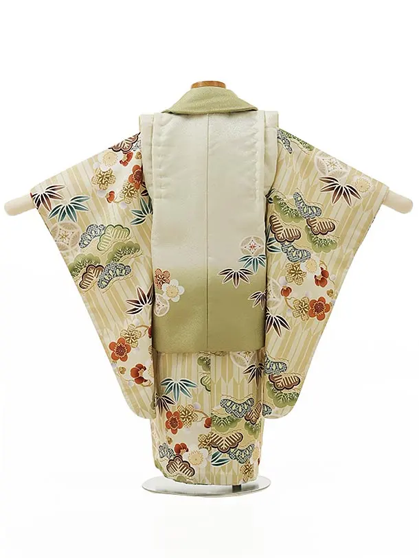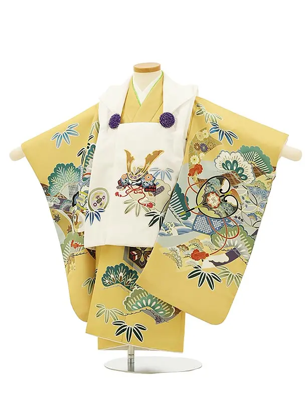 七五三(3歳男児被布)W001 白ヒワぼかし鷹×うすからし矢柄松竹梅