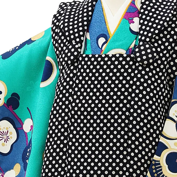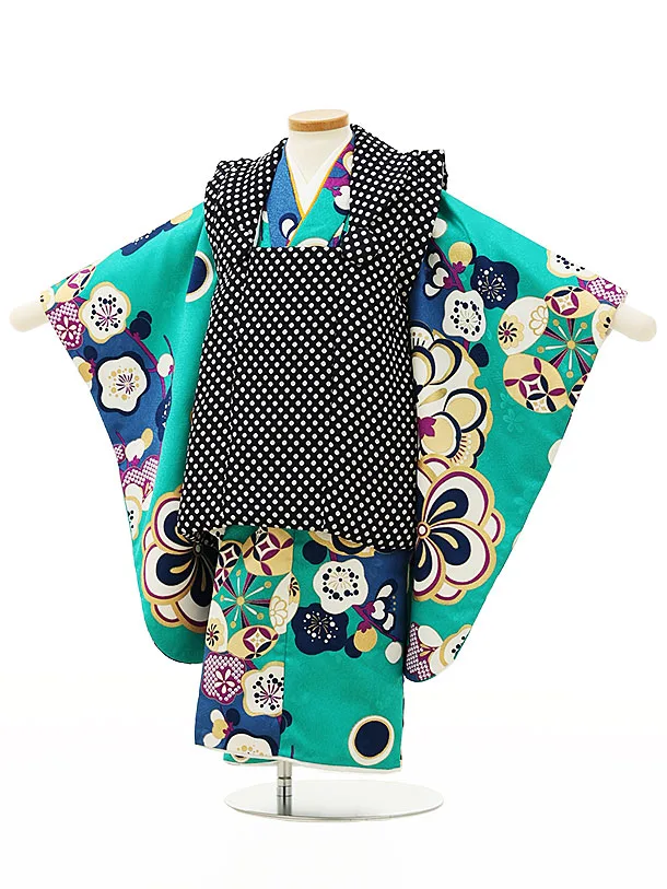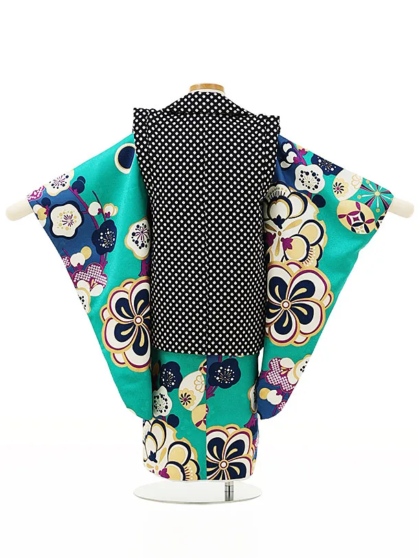七五三レンタル(3歳男児被布)W017黒ドットxエメラルドグリーン梅