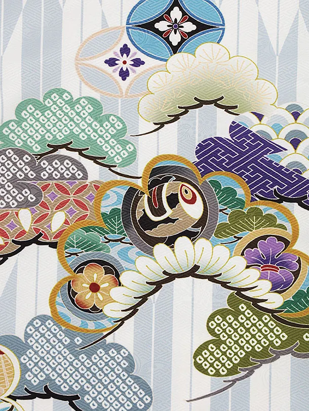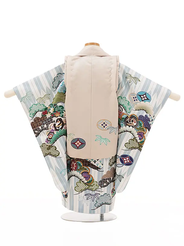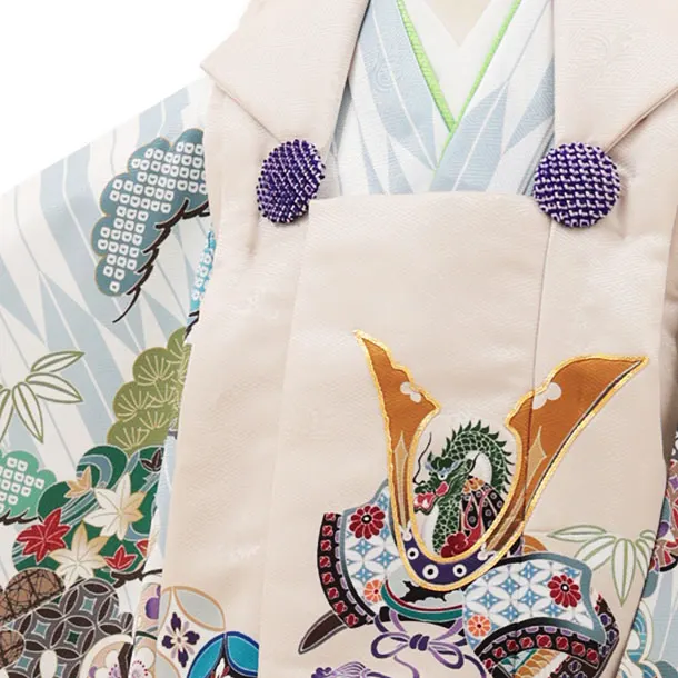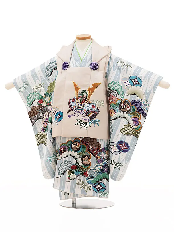 七五三レンタル(3歳男児被布)W088ベージュ兜x白グレー矢羽根吉祥文様