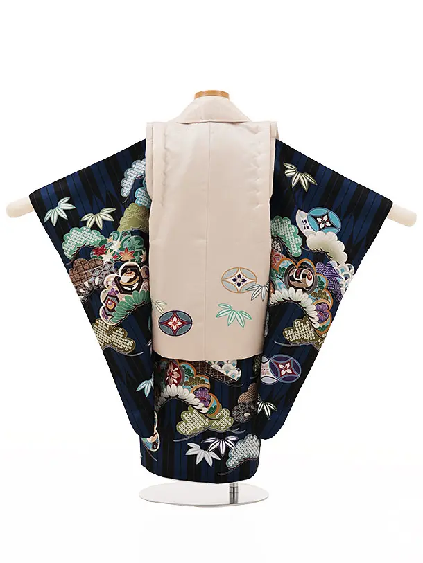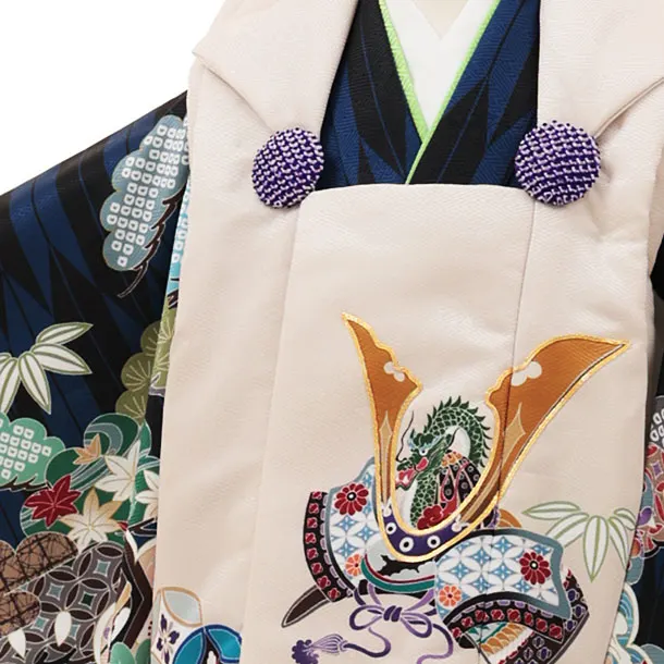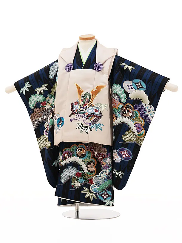 七五三レンタル(3歳男児被布)W092ベージュ兜x黒ブルー矢羽根吉祥文様