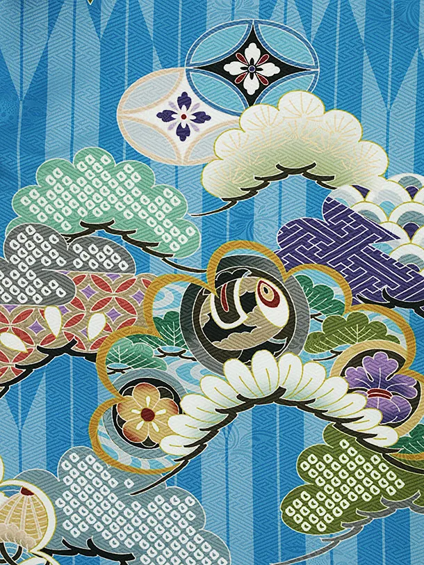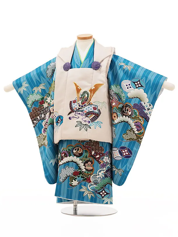 七五三レンタル(3歳男児被布)W093ベージュ兜xブルー矢羽根吉祥文様
