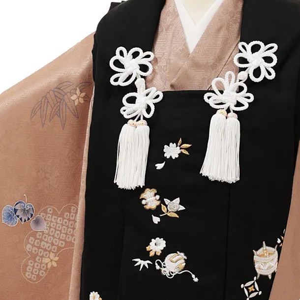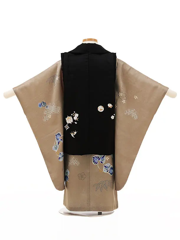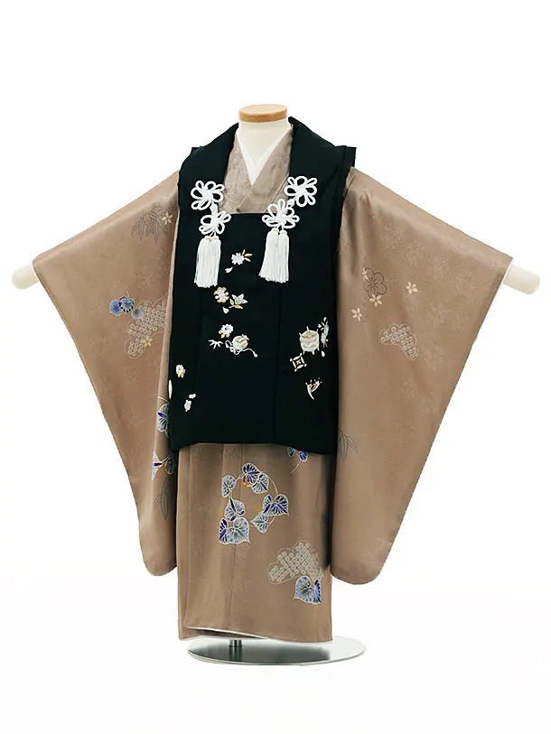 七五三レンタル(3歳男児被布)W104【正絹】黒刺繍吉祥文様xベージュ葵