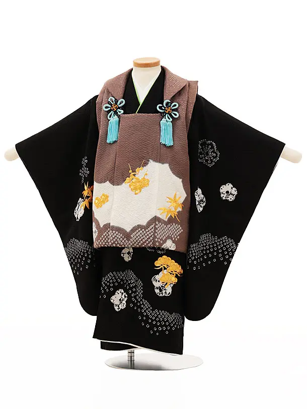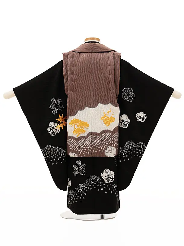 七五三レンタル(3歳男児被布)W105【正絹】グレージュx黒金刺繍松竹梅