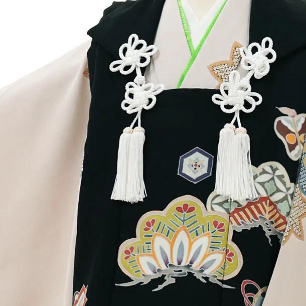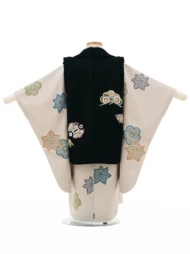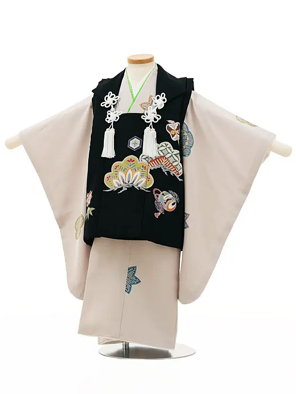 七五三レンタル(3歳男児被布)W124【正絹】黒吉祥文様xグレー小紋