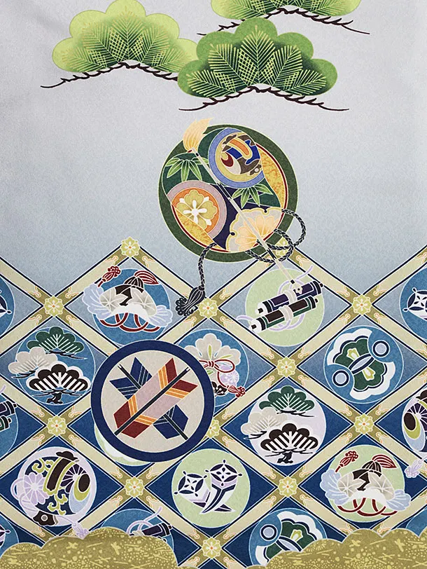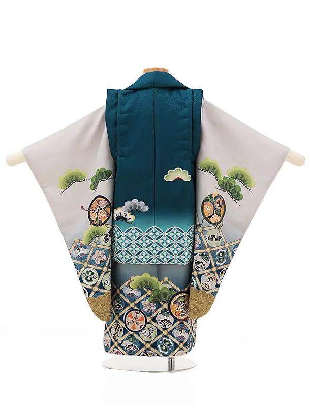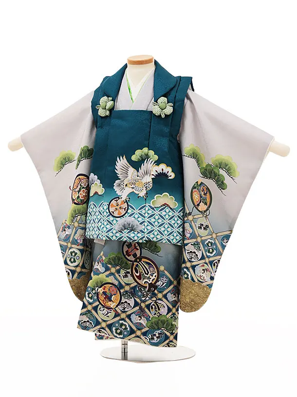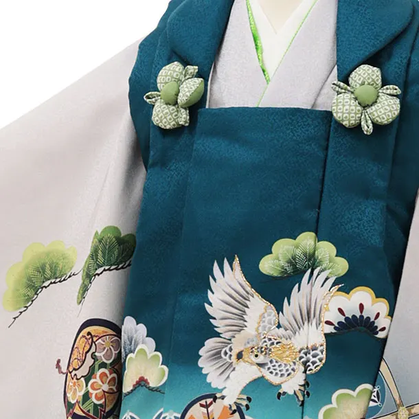 七五三レンタル(3歳男児被布)W126グリーン松鷹xグレー吉祥文様