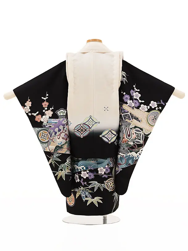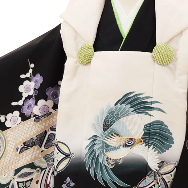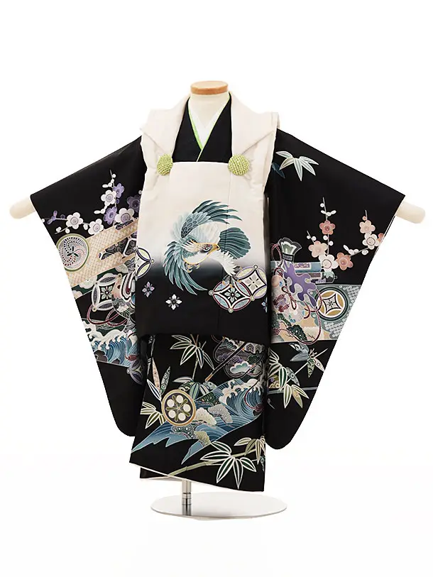 七五三レンタル(3歳男児被布)W134クリーム鷹x黒波に吉祥文様