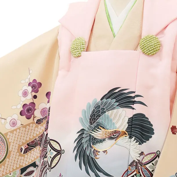 七五三レンタル(3歳男児被布)W135ピンク鷹xクリームベージュ波に吉祥文様