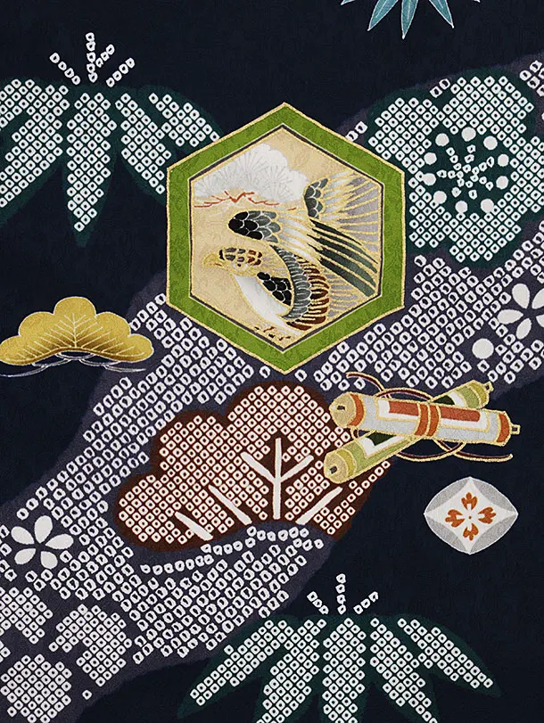 七五三(3歳)W157【高級正絹】【ようよう】グレー疋田柄刺繍鷹×紺吉祥文様