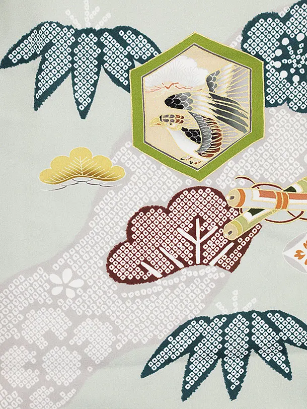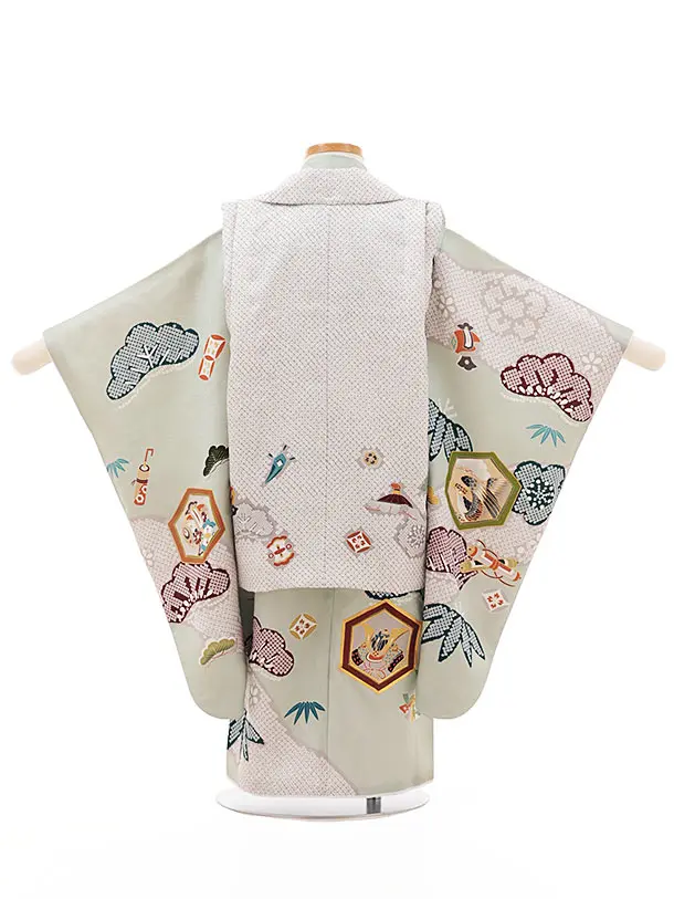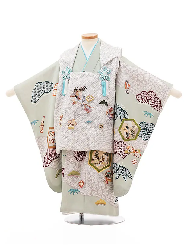 七五三(3歳)W158【高級正絹】【ようよう】薄グレー疋田柄刺繍鷹×ヒワ吉祥文様