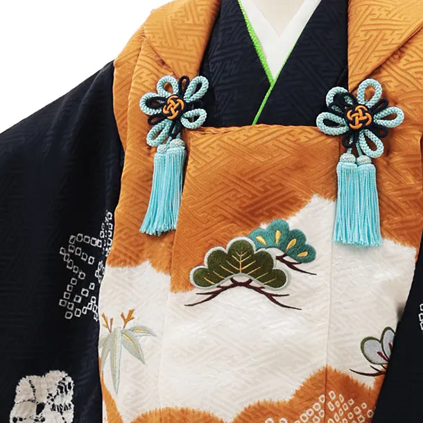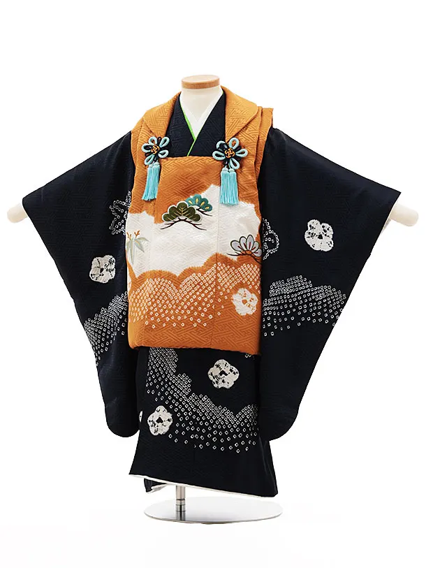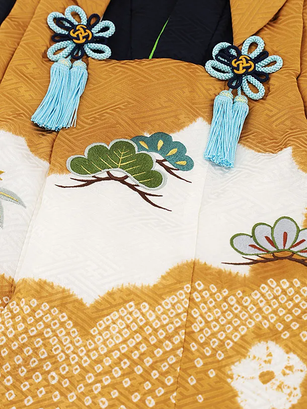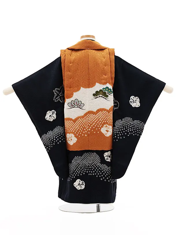 七五三レンタル(3歳男児被布)W200【正絹】金茶刺繍松竹×紺地梅