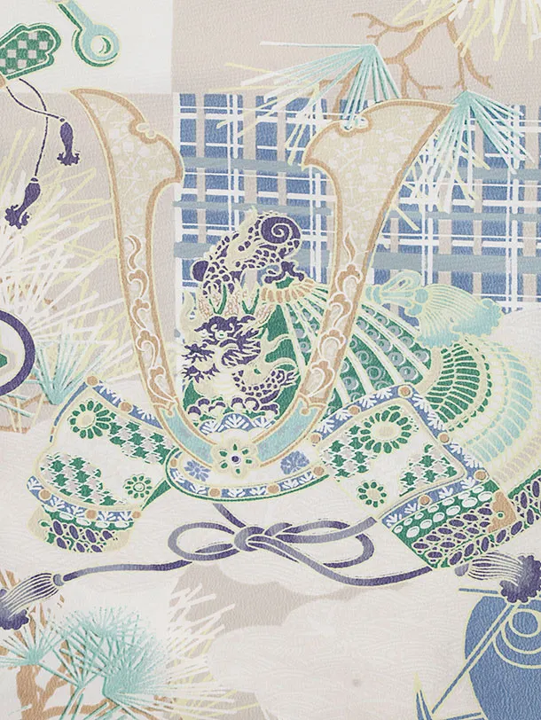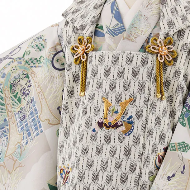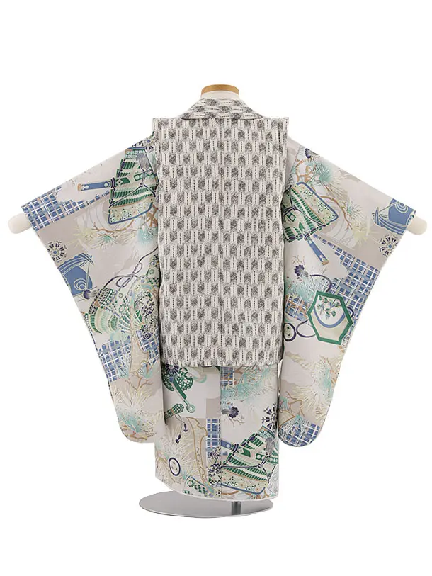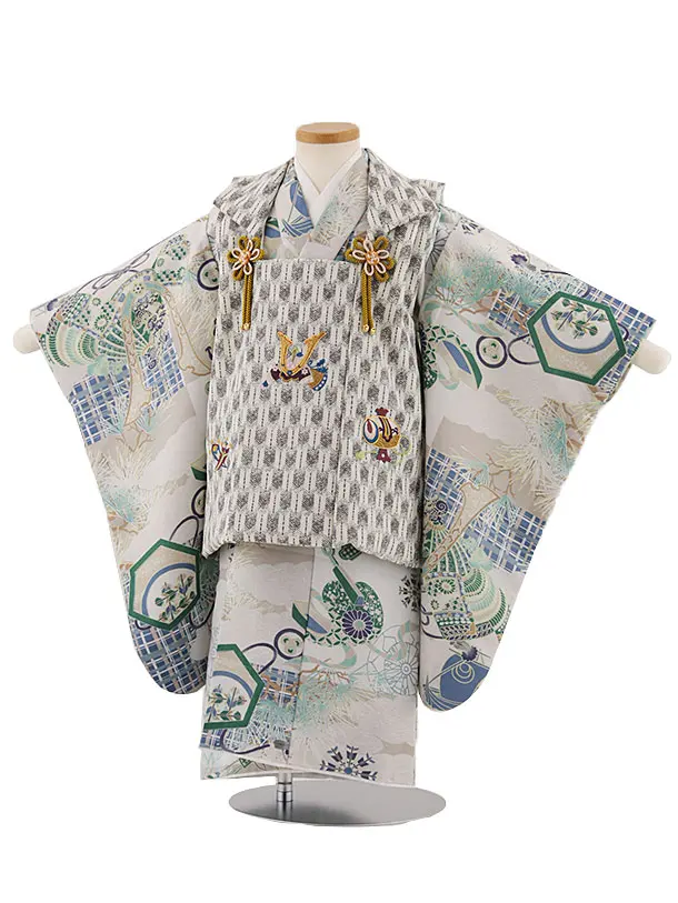 七五三レンタル(3歳男児被布)W276 白矢柄兜刺繍×グレー兜に松