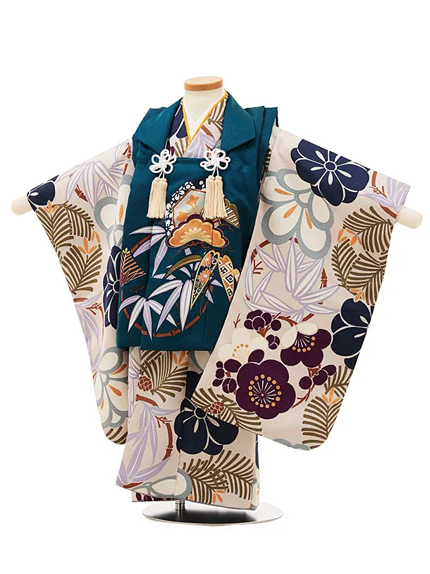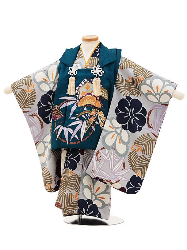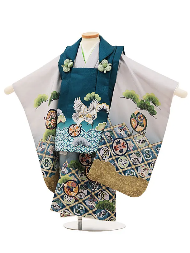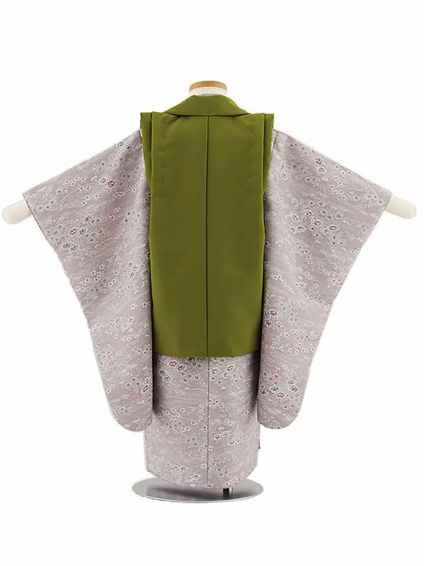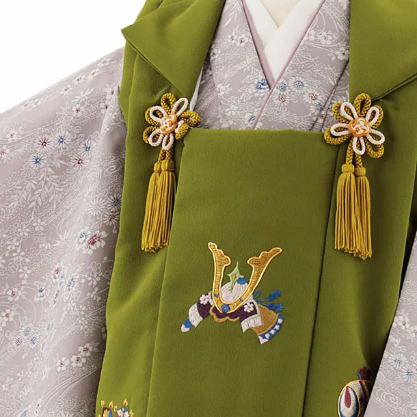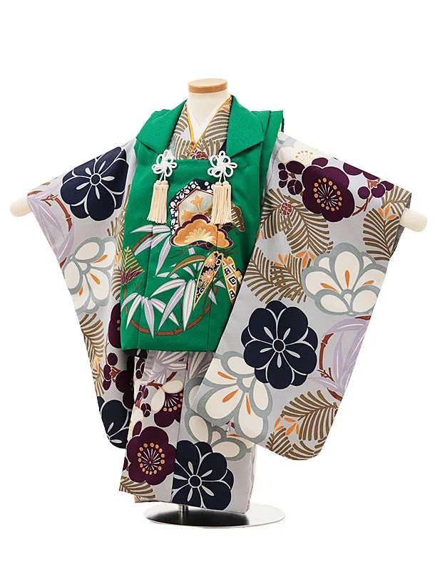 七五三レンタル(3歳男児被布)W284 グリーン刺繍兜×グレーパープル花