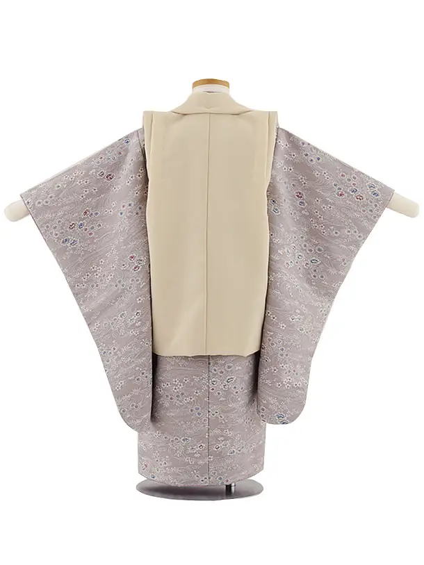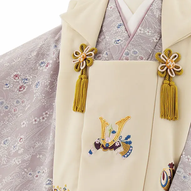 七五三レンタル(3歳男児被布)W285 ベージュ刺繍兜×グレーパープル花