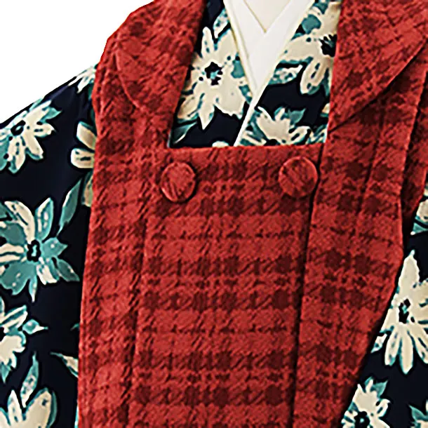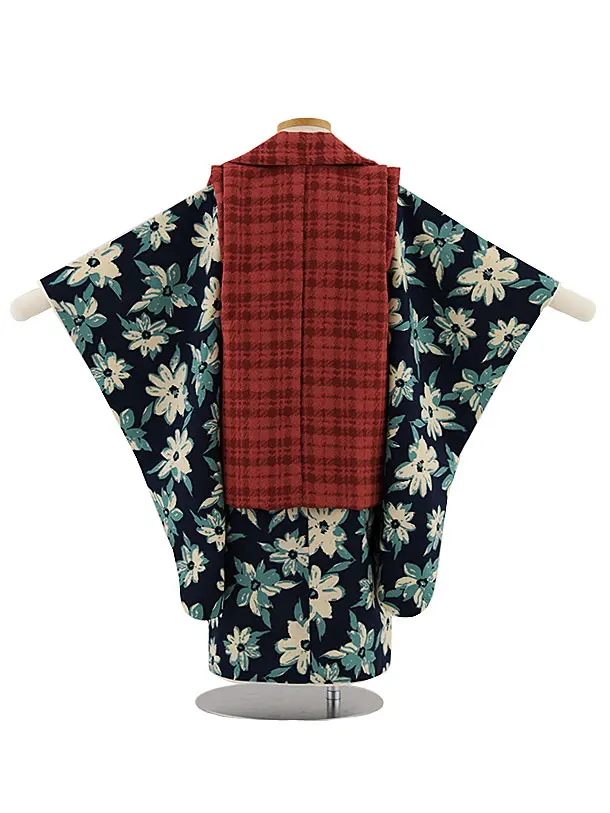 七五三レンタル(3歳男児被布)W303 赤チェック×紺フラワー