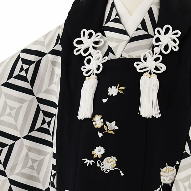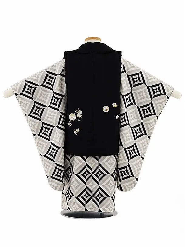 七五三レンタル(3歳男児被布)W307【正絹】黒刺繍吉祥文様×グレー変わり柄