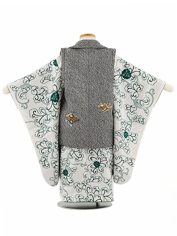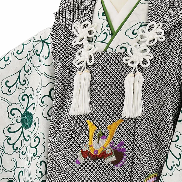 七五三レンタル(3歳男児被布)W309【正絹】黒刺繍兜×白緑変わり柄