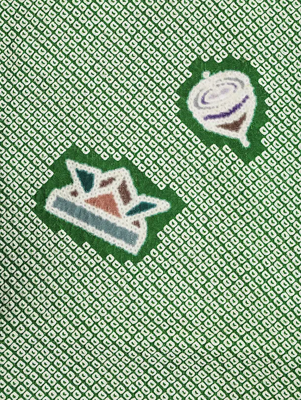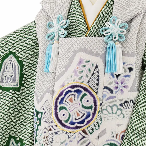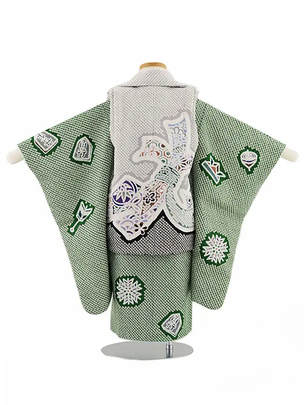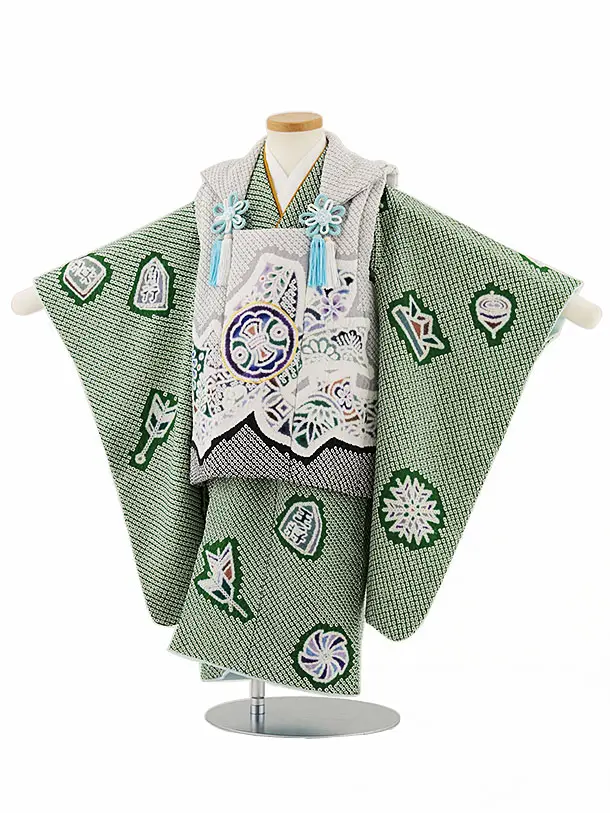 七五三レンタル(3歳男児被布)W320【正絹】絞りグレー×緑束ね熨斗におもちゃ