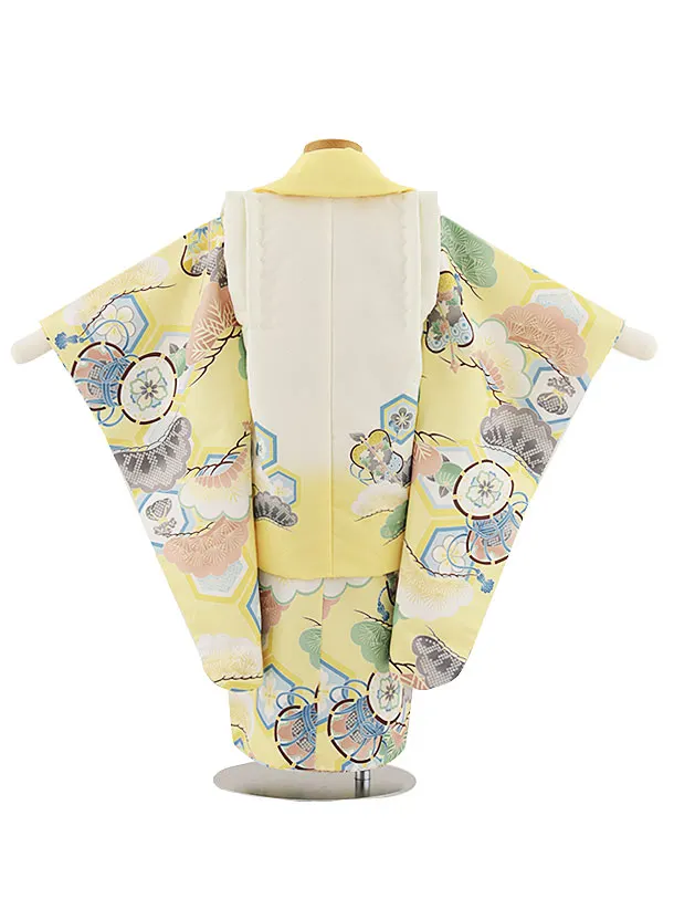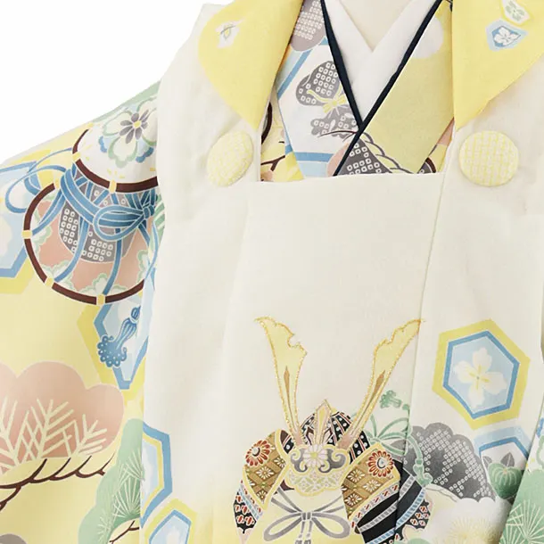 七五三レンタル(3歳男児被布)W322 白黄に兜×亀甲紋に松