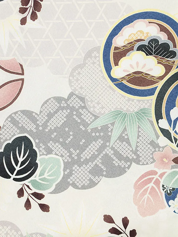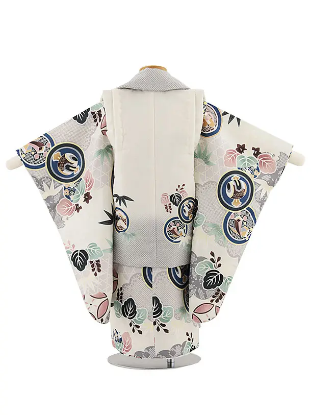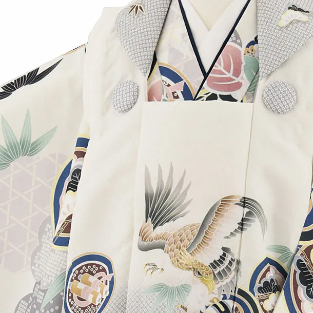 七五三レンタル(3歳男児被布)W330 白グレー鷹×アイボリー雲取りに丸紋
