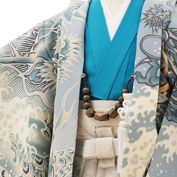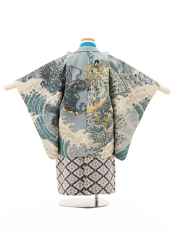 七五三レンタル(3歳男袴)W377 水色 波に龍×アイボリー紺