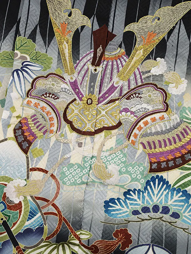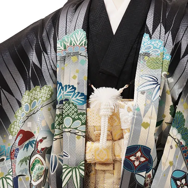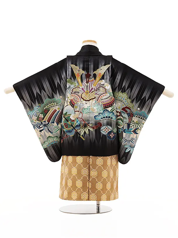 七五三レンタル(3歳男袴)W383 黒矢柄 刺繍兜×ベージュ金茶