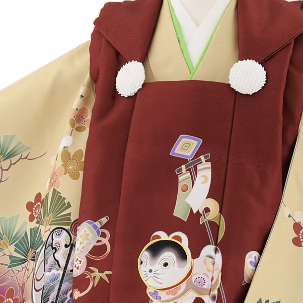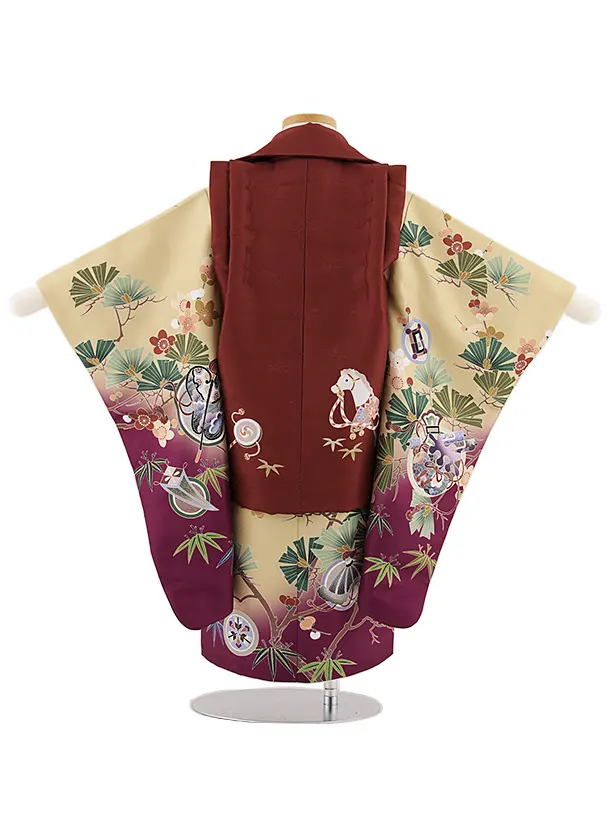七五三(3歳男児被布)W424 茶 犬張り子×ベージュパープルぼかし松竹梅