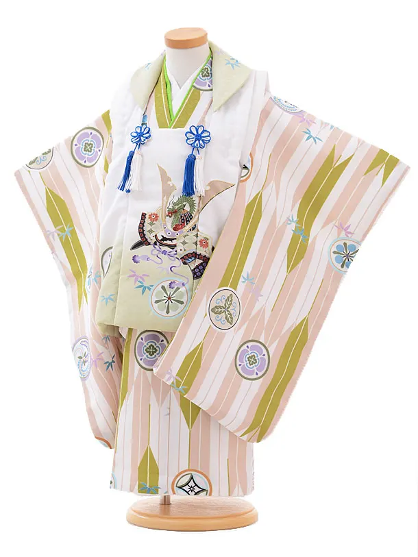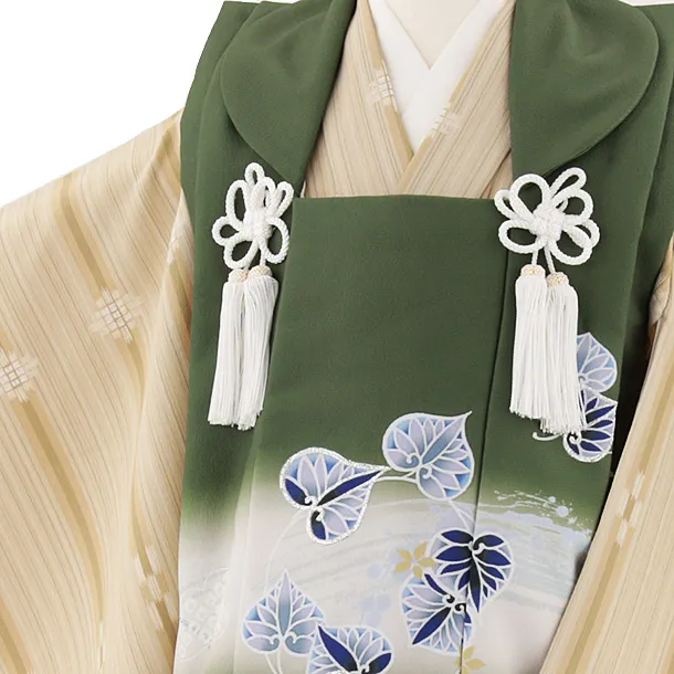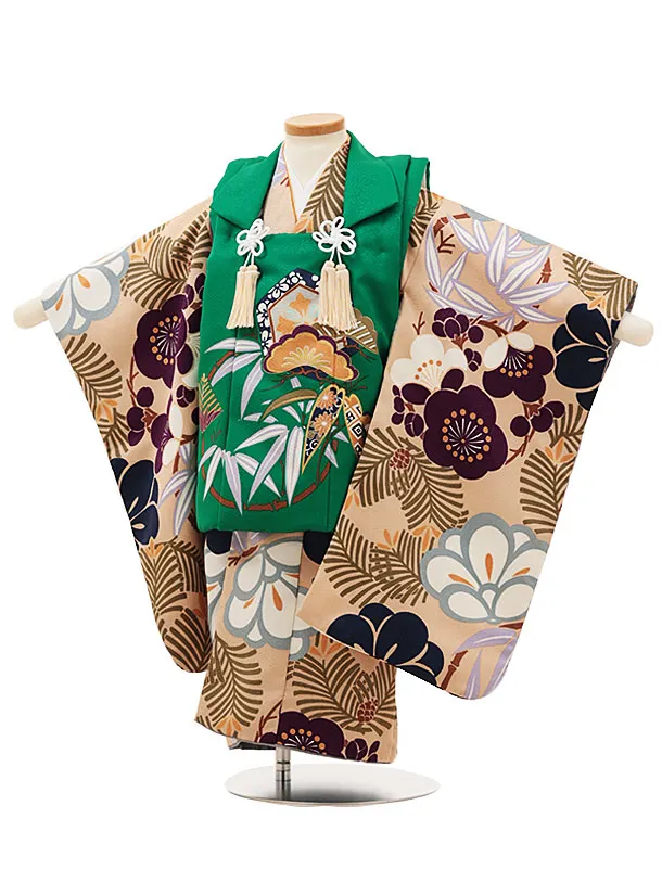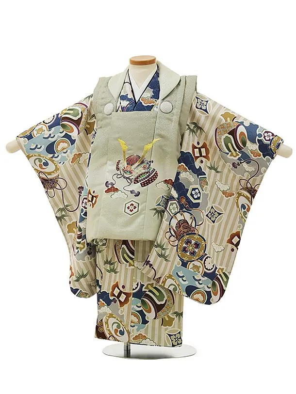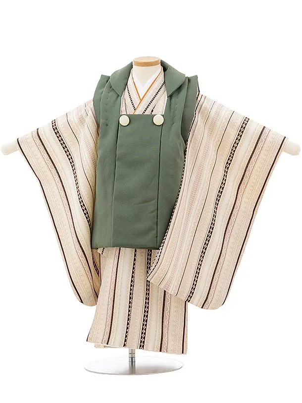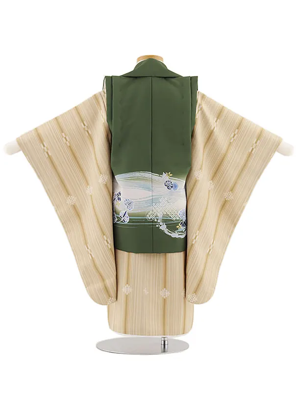 七五三レンタル(3歳男児被布)W443 グリーン葵×ベージュストライプ
