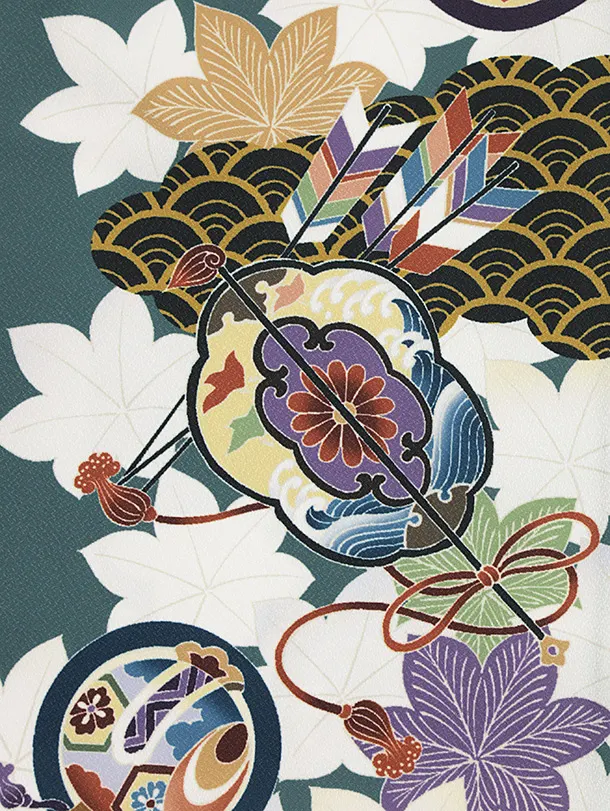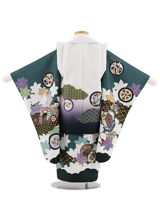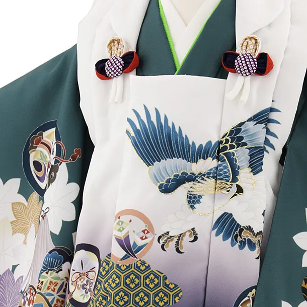 七五三レンタル(3歳男児被布)W454 白地鷹×グリーン楓に丸紋