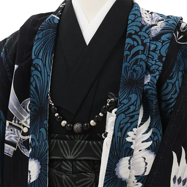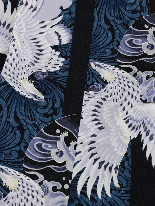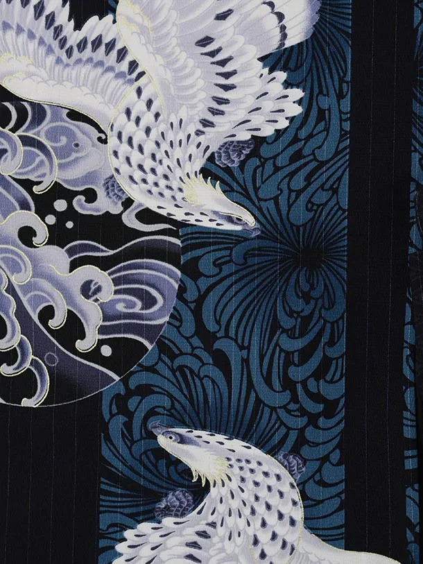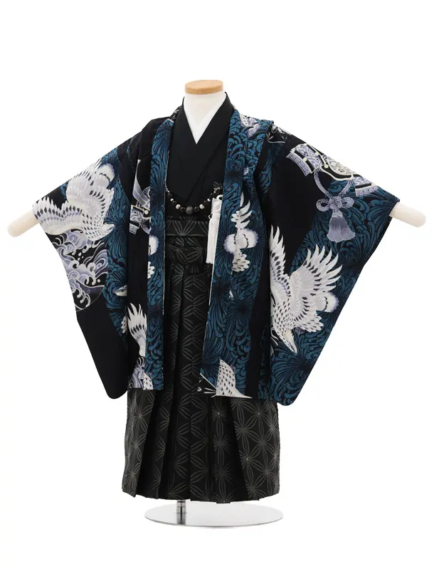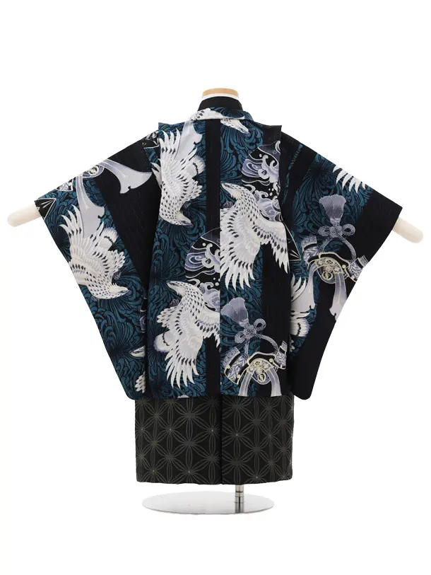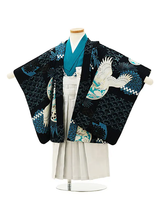 かんたん(3.4歳男児袴)W467 JAPAN STYLE 紺地 鷹に乱菊縞×黒