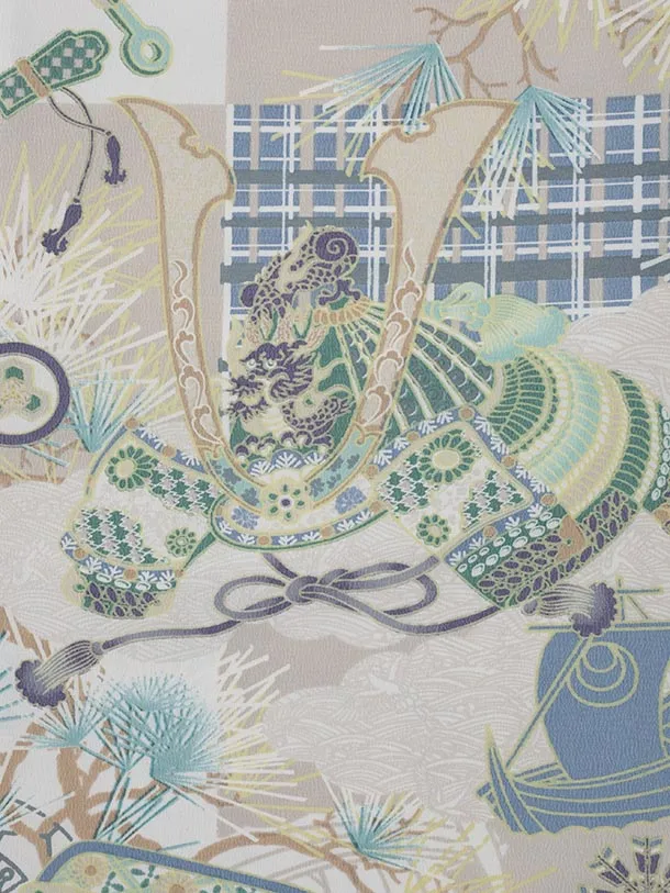七五三レンタル(3歳男児被布)W483 クリーム刺繍兜×グレー兜に松