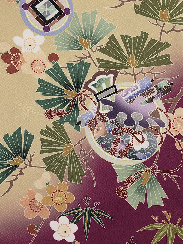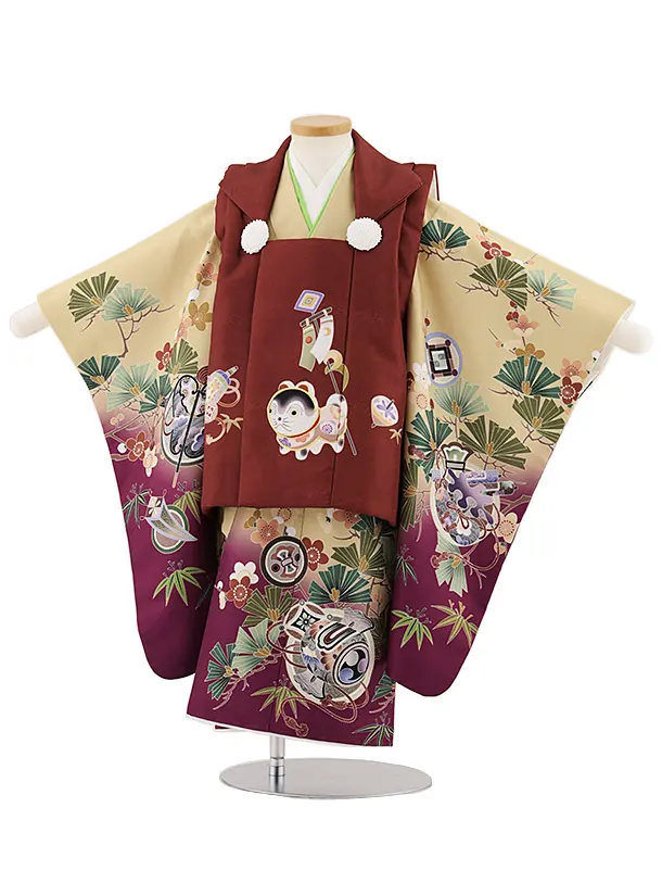七五三(2歳男児被布)W501 茶 犬張り子×ベージュパープルぼかし松竹梅