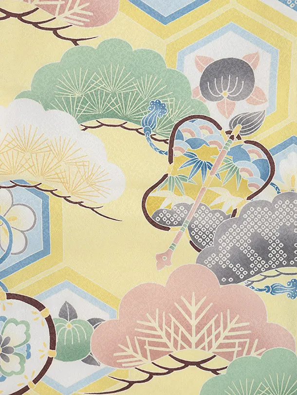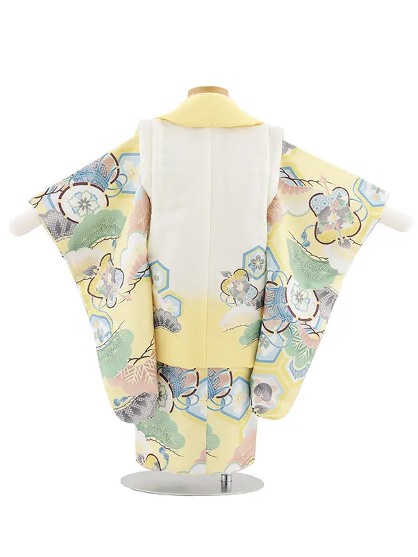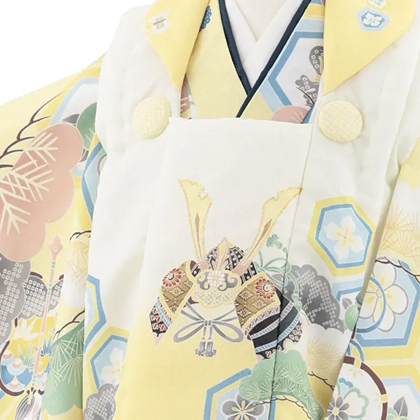 七五三レンタル(2歳男児被布)W507 白黄に兜×亀甲紋に松