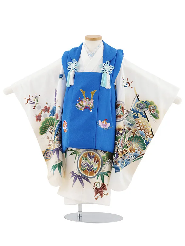 七五三レンタル(3歳男児被布)W548【正絹】青地刺繍兜×白地吉祥文様