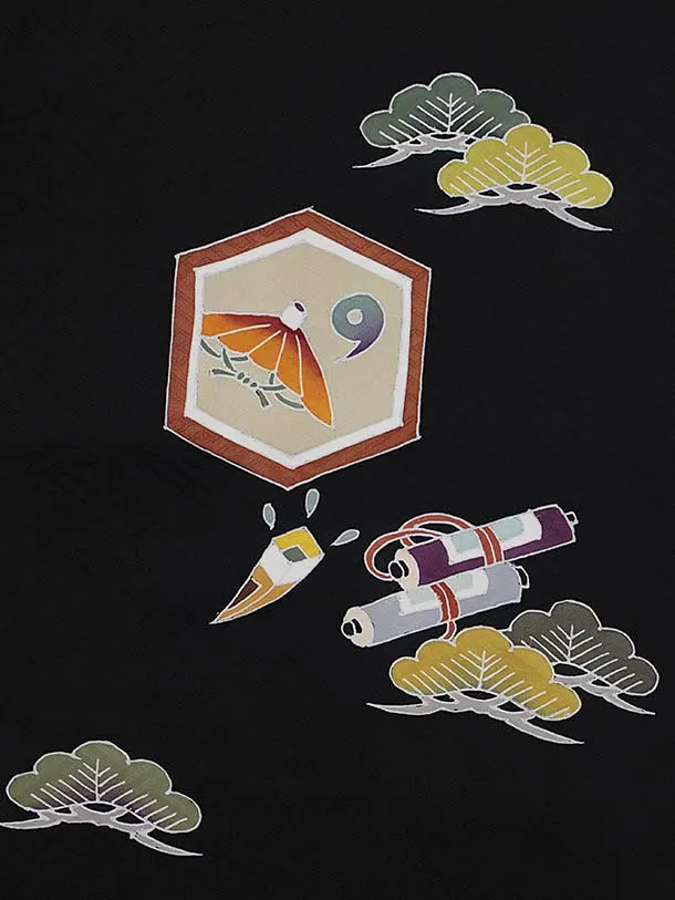 七五三レンタル(3歳男児被布)W554【正絹】グレージュ矢羽根×黒地 吉祥文様