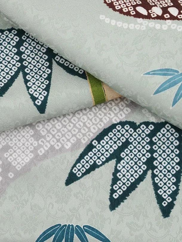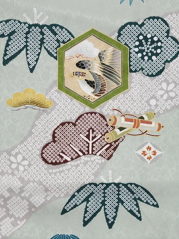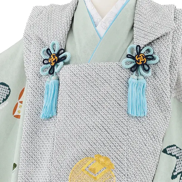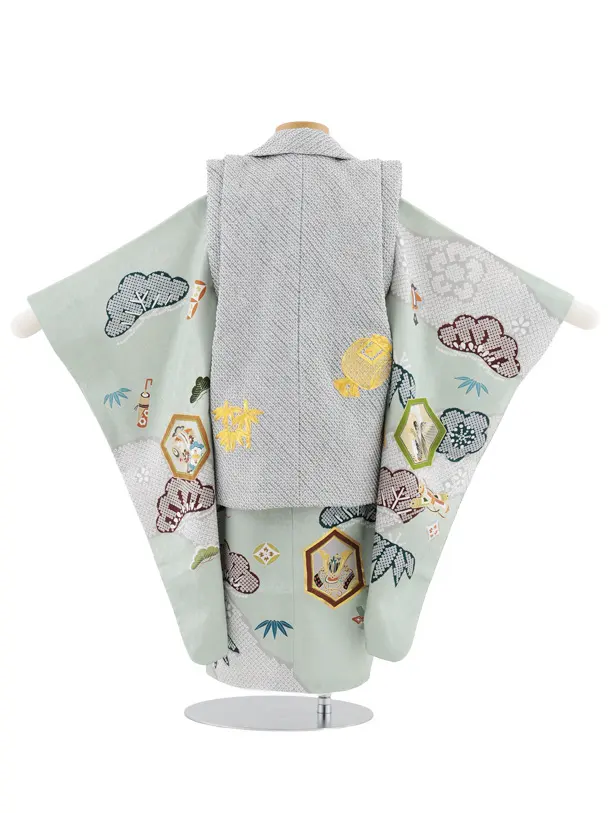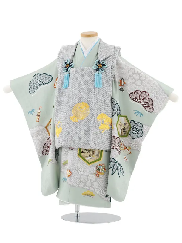 七五三(3歳男児被布)W575【正絹】グレー金コマ刺繍宝尽くし×ヒワ吉祥文様