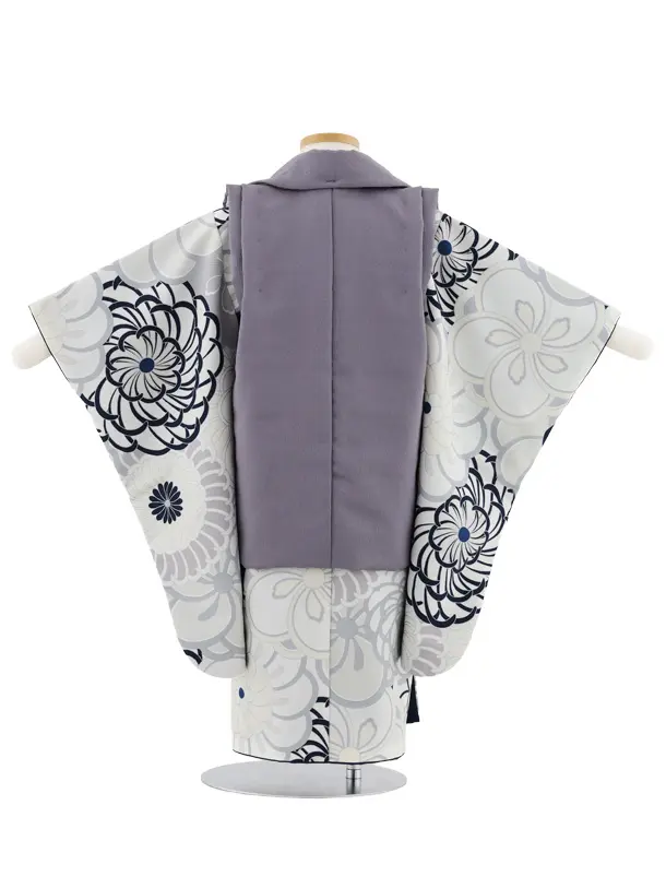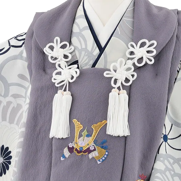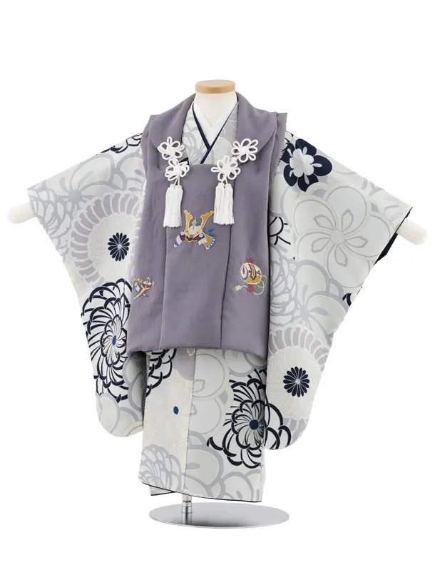 七五三(3歳男児被布)W580 グレーパープル刺繍兜×グレージュねじり梅菊