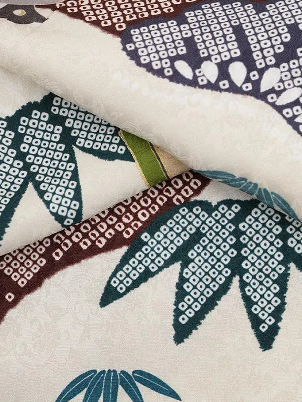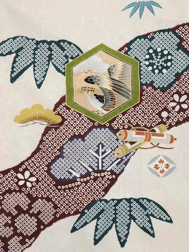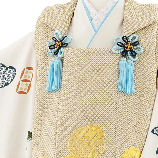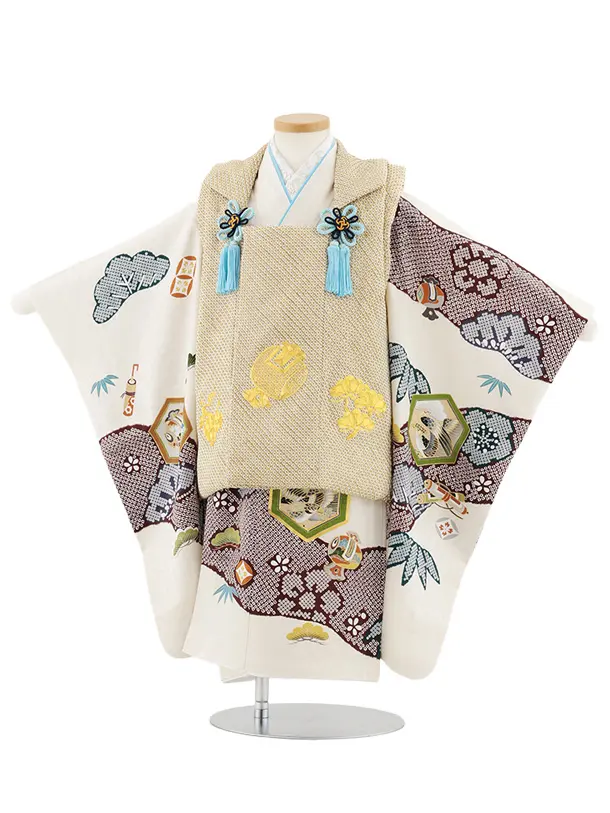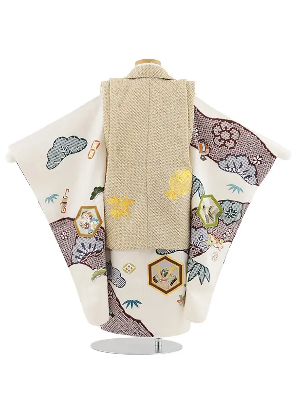 七五三(3歳男児被布)W585【正絹】ベージュ絞り金コマ×クリーム 吉祥文様