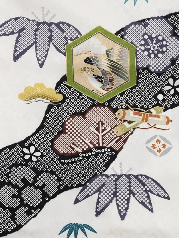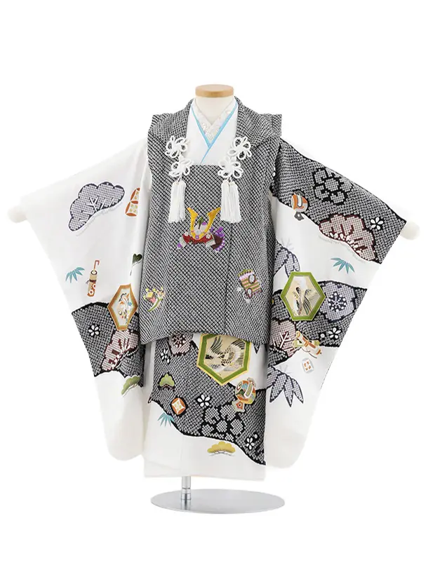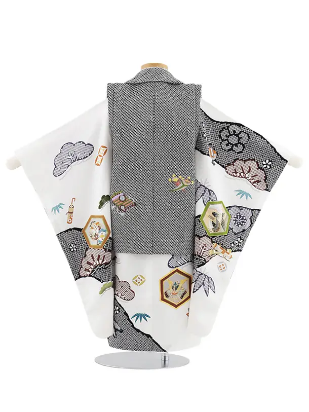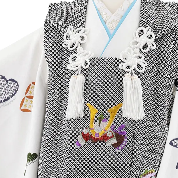 七五三レンタル(3歳男児被布)W586【正絹】黒絞り刺繍兜×白 吉祥文様