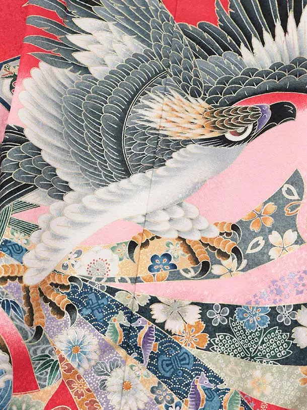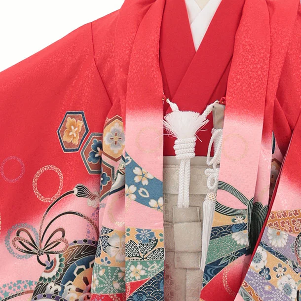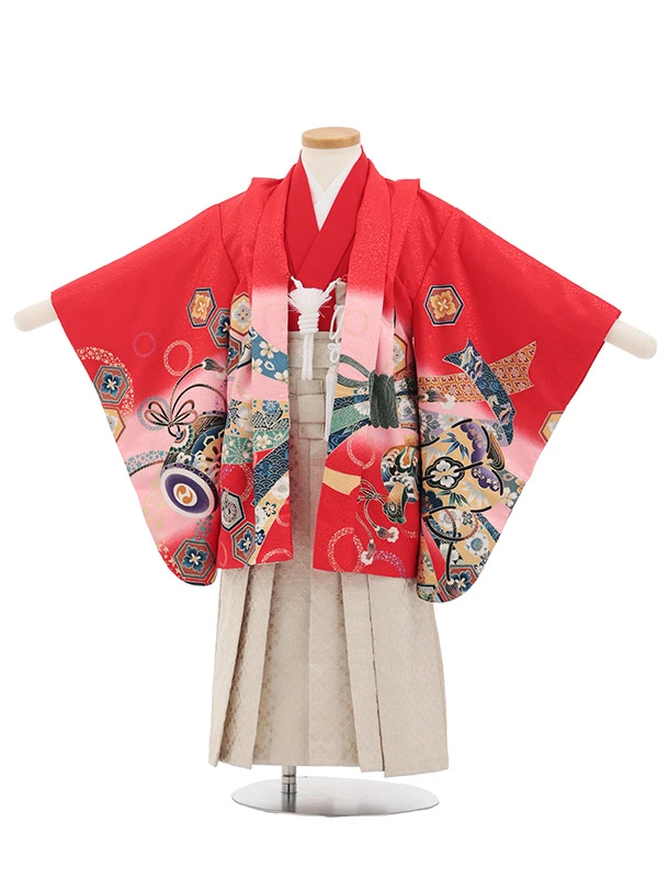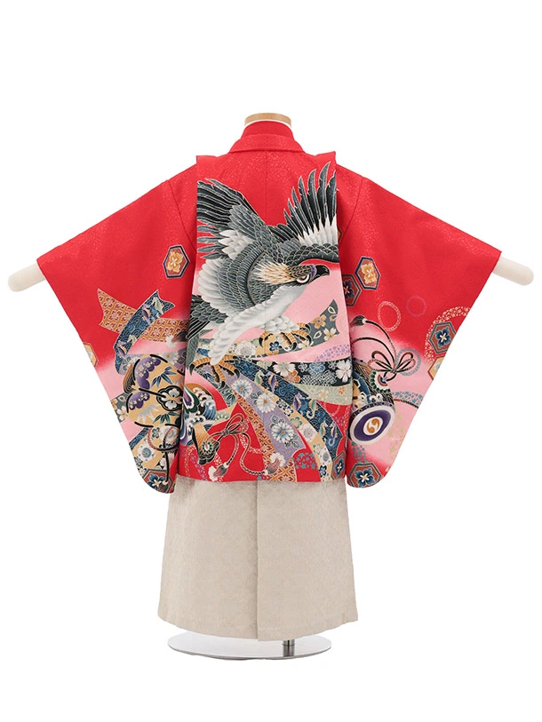 かんたん(3.4歳男児袴)W618 赤地 熨斗に鷹×ベージュラメ