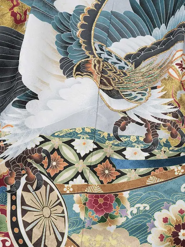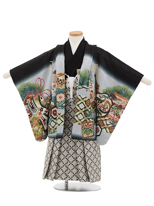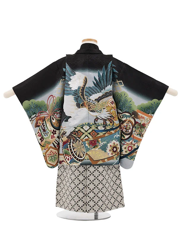 かんたん(3.4歳男児袴)W620 黒地 松鷹 吉祥文様×ベージュラメ黒
