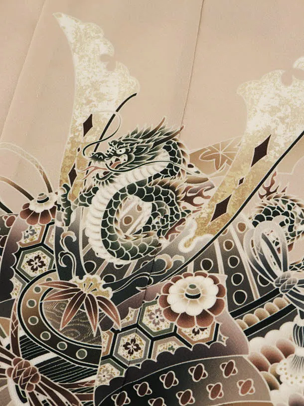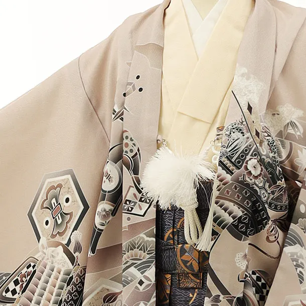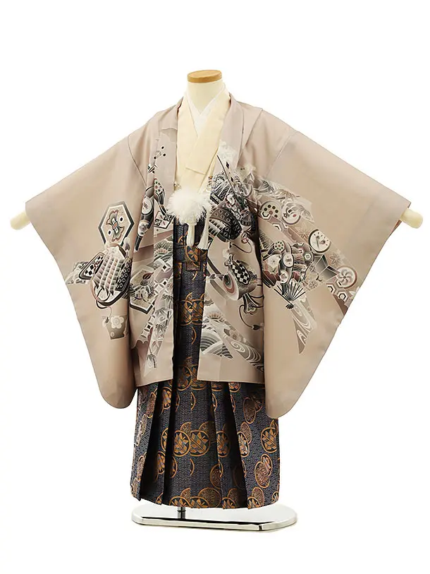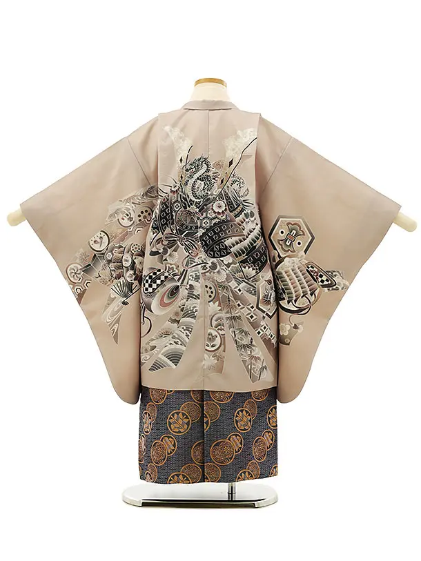 かんたん七五三レンタル(5歳男袴)X016ベージュ束ね熨斗兜x紺丸紋袴