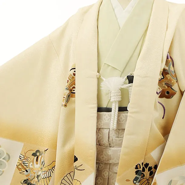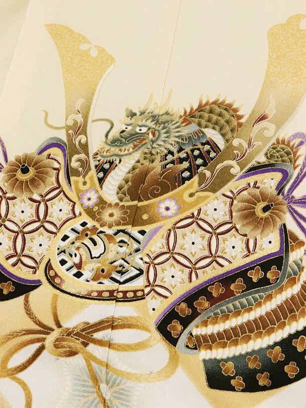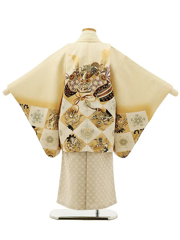 かんたん七五三レンタル(5歳男袴)X028クリーム色菱に兜xベージュ袴