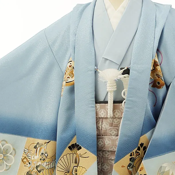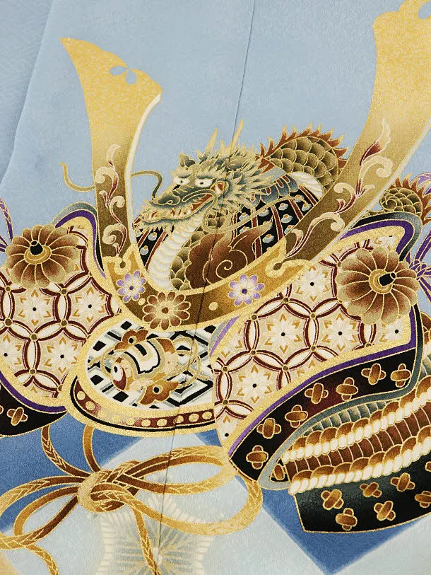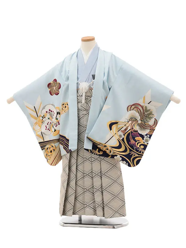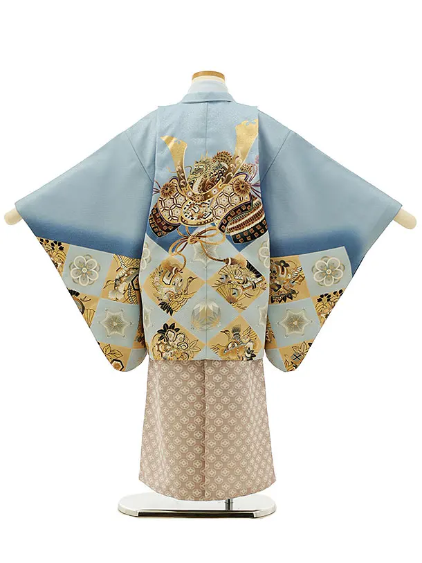 かんたん七五三レンタル(5歳男袴)X030水色菱に兜xピンクベージュ袴